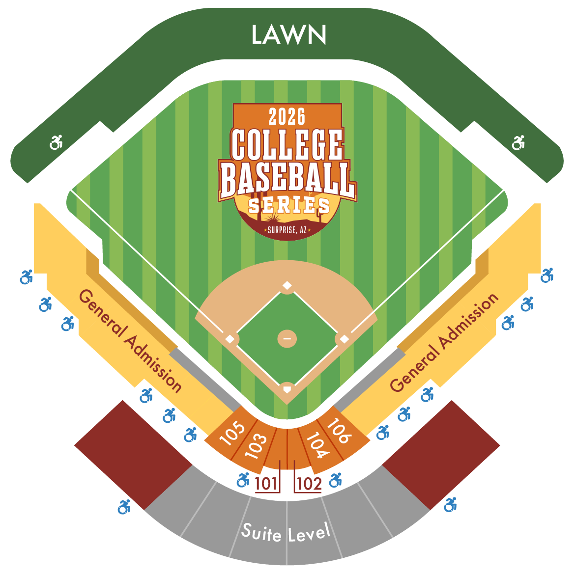 All seating is general admission except for Home Plate Reserved sections (101–106) on Friday, Feb. 13 through Sunday, Feb. 15. Sections 101–106 are reserved exclusively for Home Plate Reserved ticket holders during those dates.